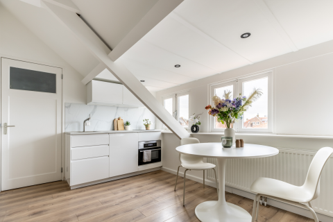 Tweede verdieping: overloop met inbouwkast, door dakkapellen twee slaapkamers met inbouwkasten, tussen de twee slaapkamers in een tweede, compacte badkamer voorzien van douche en wastafel. Achter de knieschotten vind je volop extra bergruimte.